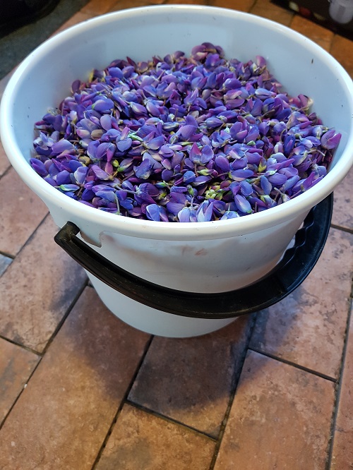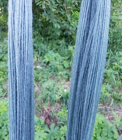 Ensimmäisen värjäyskokeiluni tein sinisillä lupiinin kukilla. Väristä tuli aivan ihan petrolinsininen. Monista kukista saatavissa väreissä on vain usein se huonon puoli, että värit eivät ole kovin hyvin pysyviä. Lupiinin kukilla odotettavissa on todennäköisesti valon aiheuttamaa haalistumista. Sinisyys tulee katoamaan, joten se pitää ottaa huomioon neuletta suunniteltaessa. Ei siis paras mahdollinen värjäyskasvi, mutta värinä on kyllä aivan ihana.
