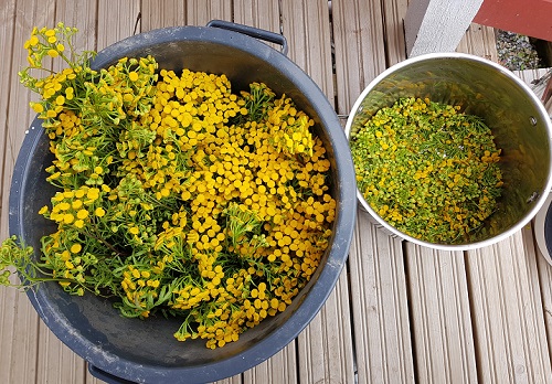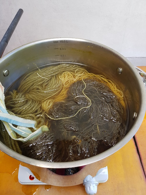 Pietaryrtti on perinteinen värjäyskasvi ja siitä saadaan usein hyvin voimakkaita keltaisia sävyjä. Siis saadaan usein, mutta ei aina, sillä minun pietaryrttikokeiluni eivät ole keltaisia vaan enemmän vihreän suuntaisia. Ei se mitään, ihan kauniita värejä nekin, mutta taidan vielä kuitenkin kokeilla uudelleen hyvän keltaisen saamista pietaryrtin nappikukinnoista. Värjäsin osan langoista myös pietaryrtin pelkillä varsilla. Niistä saatava väri oli keltavihreä sekin.