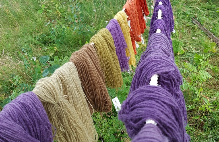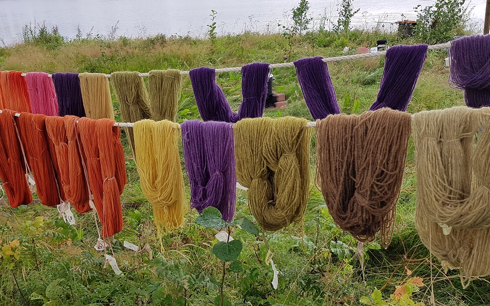 Sunnuntai kului vielä värjäyspatojen höyryssä. Osa langoista oli myös jätetty yön yli jälkiväreihin ja kuivatusnarulle alkoikin ilmestymään mitä mahtavimpia värisuoria. Langat esihuuhdeltiin rannassa, mutta parempi pesu jäi kotitöiksi. Kurssi oli kokonaisuudessaan oikein onnistunut ja kiva. Edes lauantaille osunut rankkasade ei haitannut innokkaita värjäreitä. Kotiintuomisina minulla oli kilon verran mahtavan värisiä lankoja.
