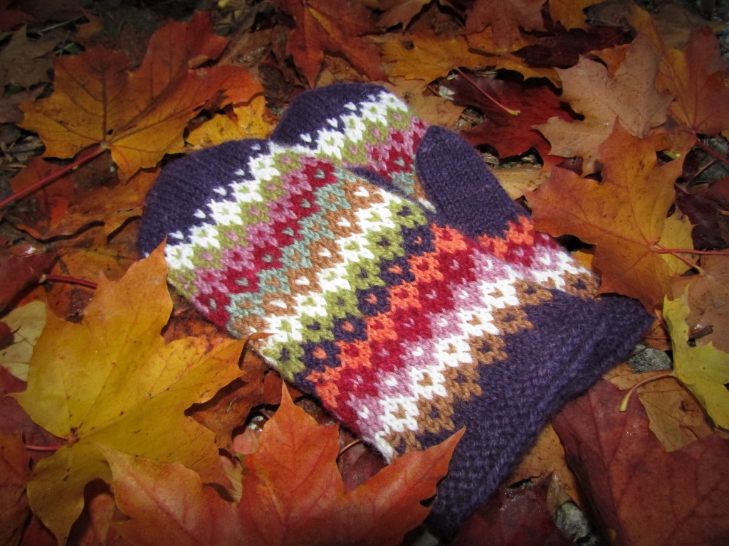Kasvivärit ovat siitä jänniä, että ne tuntuvat jostain syystä sopivan kaikki yhteen. Sopivilla väripareilla voidaan kuitenkin korostaa eri asioita ja tuoda esille väristä eri puolia. Intensiiviset värit voivat saada toivottua hillintää hieman rauhallisemmista sävyistä ja puolestaan hieman valjuiksi tai rumiksi jääneet värit voivatkin nousta aivan uuteen loistoon sopivan kaverin kyljessä. Koska olen tähän mennessä halunnut testata värjäyskasveja ja kerännyt itselleni värikarttaa, on minulla nyt monta eriväristä kerää. Niiden käytössä kirjoneuleet ovat oiva ratkaisu. Ensimmäiseksi kokonaan kasviväreillä neulotuksi työksi valmistuivat lapaset. Niissä halusin kokeilla mahdollisimman montaa eri väriä ja niistä tuli oikein mieluisat. Mutta raaskiikohan niitä käyttää ollenkaan??