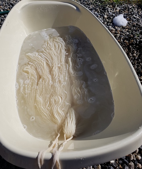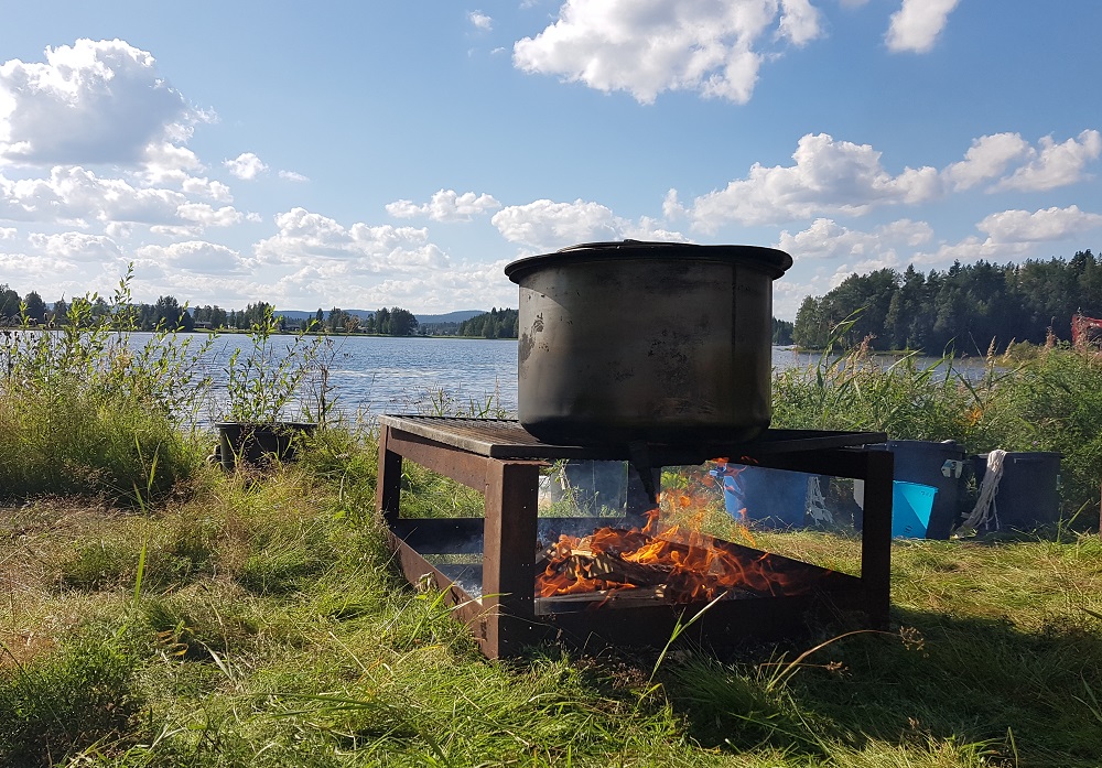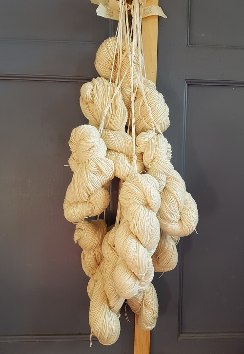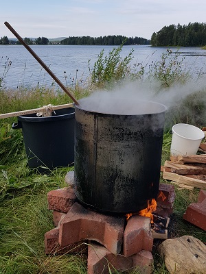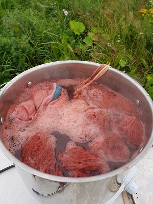 Kurssin esivalmisteluihin kuului luonnollisesti myös lankojen hankinta, vyyhditys ja pesu. Minä valitsin värjättäväksi langaksi Esiton 100% villalankaa. Puretimme langat ensimmäisenä kurssipäivänä. Puretusaineiksi käytimme alunaa ja viinikiveä. Isojen patojen lämmittäminen avutulella oli melko hankalaa ja kuumaa puuhaa. Isoja patoja taisi olla yhdeksän, joten puuta sai kantaa kyllä melkoisesti. Langat jätettiin yön yli jäähtymään puretusliemeen. Illalla myös laitoimme likoamaan seuraavan päivän värjäysaineita, jotta niistä saisi hyvän väriliemen keitettyä seuraavana päivänä.
