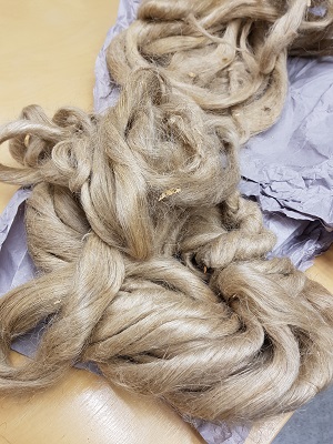 Materiaaleja meillä löytyi moneen lähtöön: villaa erirotuisista lampaista, pestyä ja pesemätöntä, värejäkin oli useita erilaisia. Otin myös mukaani ikivanhat pellava-aarteeni. Olen saanut isovanhempieni varastoista löytyneen pellavakäärön, joka kuuleman mukaan on peräsin kahden saaristolaismummun varastoista. He elivät koko ikänsä isovanhempieni mökkisaarella ja ovat kasvattaneet pellavat todennäköisesti omia töitään varten. Muistan itsekin käyneeni heidän luonaan melko nuorena. Ihana tarina ja ihanaa aivinaa ( eli sitä hienoa pellavakuitua, karheampaa kuitua kutsutaan rohtimeksi).