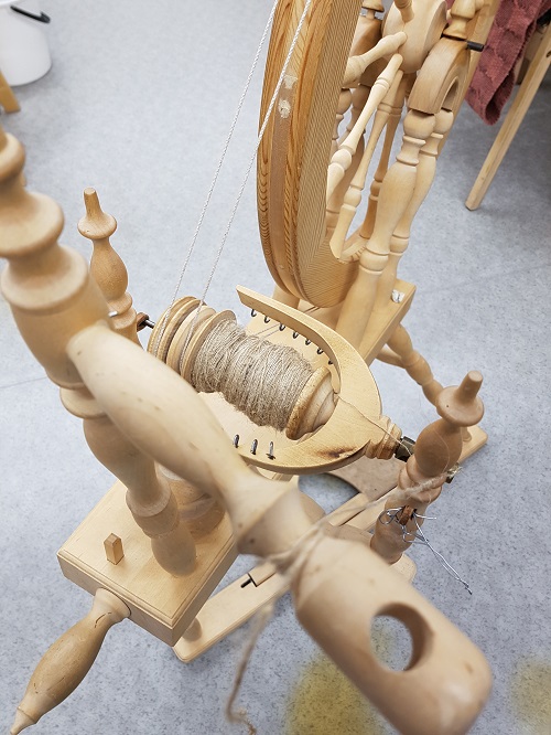 Koululla löytyi opiskelijoiden käyttöön monta perinteistä vinorukkia ja yksi moderni pystyrukki. Varsinkin vanhat rukit ovat kaikki yksilöitä ja niiden metkut ja ominaisuudet vaikuttavat kehruutyöhön. Toisin sanoen niissä on luonnetta. Moderni pystyrukki vaati ainakin itseltäni melkoisesti makustelua, eikä rakkautta oikein löytynyt päivän harjoittelun jälkeenkään. Mutta jonkunlaista jälkeä sain kuitenkin aikaiseksi. Kehruu on monien muidenkin kädentaitojen tavoin harjoitusta vaativa laji. Pitempään kehränneet saavat aikaiseksi mitä upeimpia tasalaatuisia lankoja. Kehruuseen voidaan käyttää myös mitä erilaisimpia materiaaleja: eri eläinten karvoja, kasvikuituja yms.