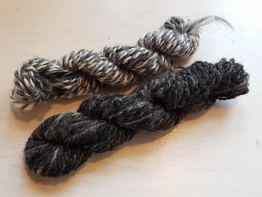 Omat lankani lukeutuvat lähinnä sinne efektilankojen osastoon. Pääasia on, että sain kuitenkin lankoja aikaiseksi ja toivottavasti joskus minulla on mahdollisuus panostaa enemmän aikaa kehräämisen opetteluun. Ihastuin erityisesti ahvenanmaanlampaan villaan. Ahvenanmaanlampaan villa poikkeaa suomenlampaan ja kainuun harmaksen villasta villan kaksikerroksisen rakenteensa ansioista. Villassa on selkeästi havaittavissa pehmeämpi alusvilla ja pidempi ja karheampi peitinkarva. Myös värit voivat vaihdella paljon jopa yhden lampaan villassa.