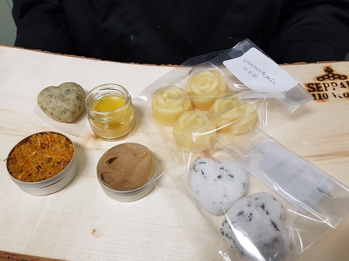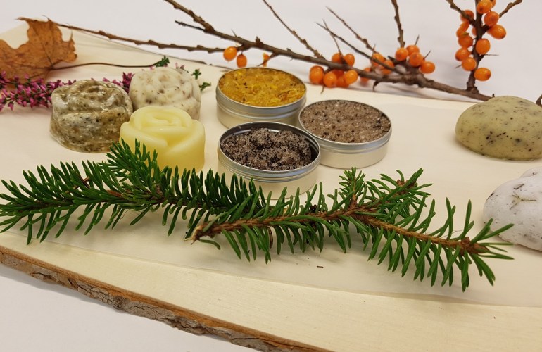 Koulun kosmetiikkakursseilla kokeilimme monia erilaisia reseptejä. Teimme saippuoita, shampoota, hoitoainetta, ihovoiteita, deodorantteja ja kuorintatuotteita. Teimme erilaisia kasviuutoksia, kokeilimme emulgaattoreita ja opettelimme öljyjen ja kasvien vaikutuksia. Paljon uutta opittavaa mahtui noihin kurssipäiviin, mutta pakko on todeta, että opettajamme on alansa huippuammattilainen ja hänen opissaan oli hyvä olla. Nyt kaapit pursuavatkin kurssien tuotoksia. Hieman on pitänyt myös lahjoittaa tuotteita eteenpäin, sillä meillä ei tällä hetkellä ihovoiteet käyttämällä lopu.