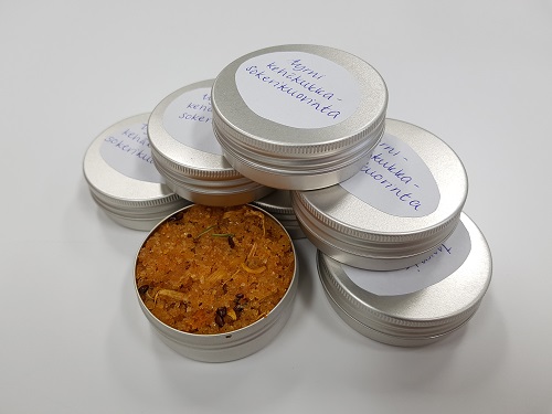 Tyrni-kehäkukkakuorintatuote vartalolle kuorii ihoa sokerin avulla.